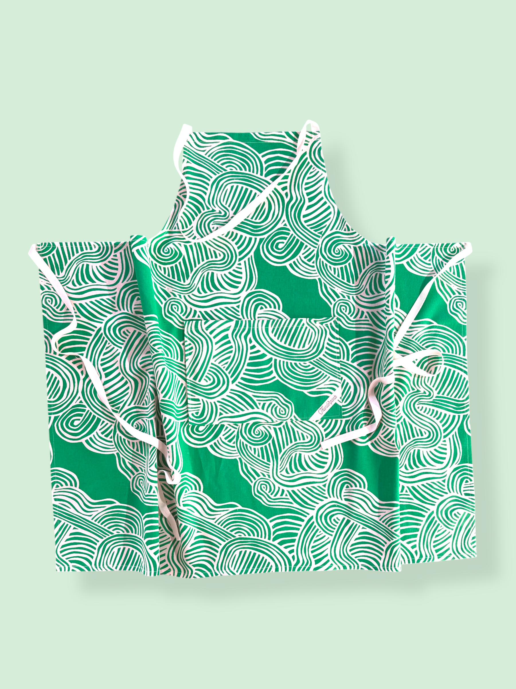 Made from fairtrade certified organic cotton. Approx 85cm top to bottom and 100cm across. This apron has generous ties and neck loop, if you need a shorter neck loop just tie it off at desired length. Has a large pocket in the front for all your grilling, baking or cleaning tools.