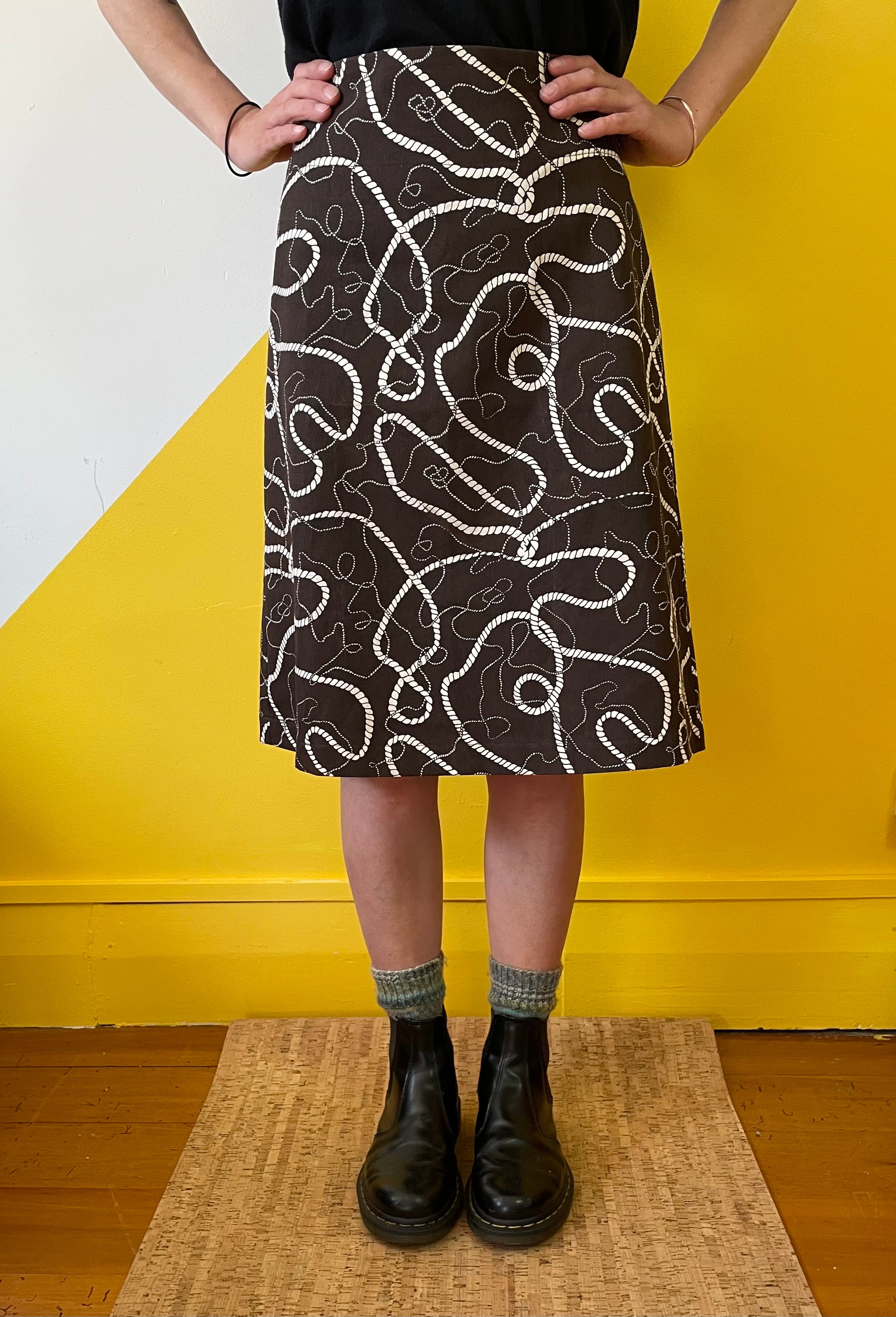 Check the size chart to see where you fit here. The skirt is a simple a-line. The waistband has a nice wide yoke to make it sit flat & there is an invisible zip at the back.