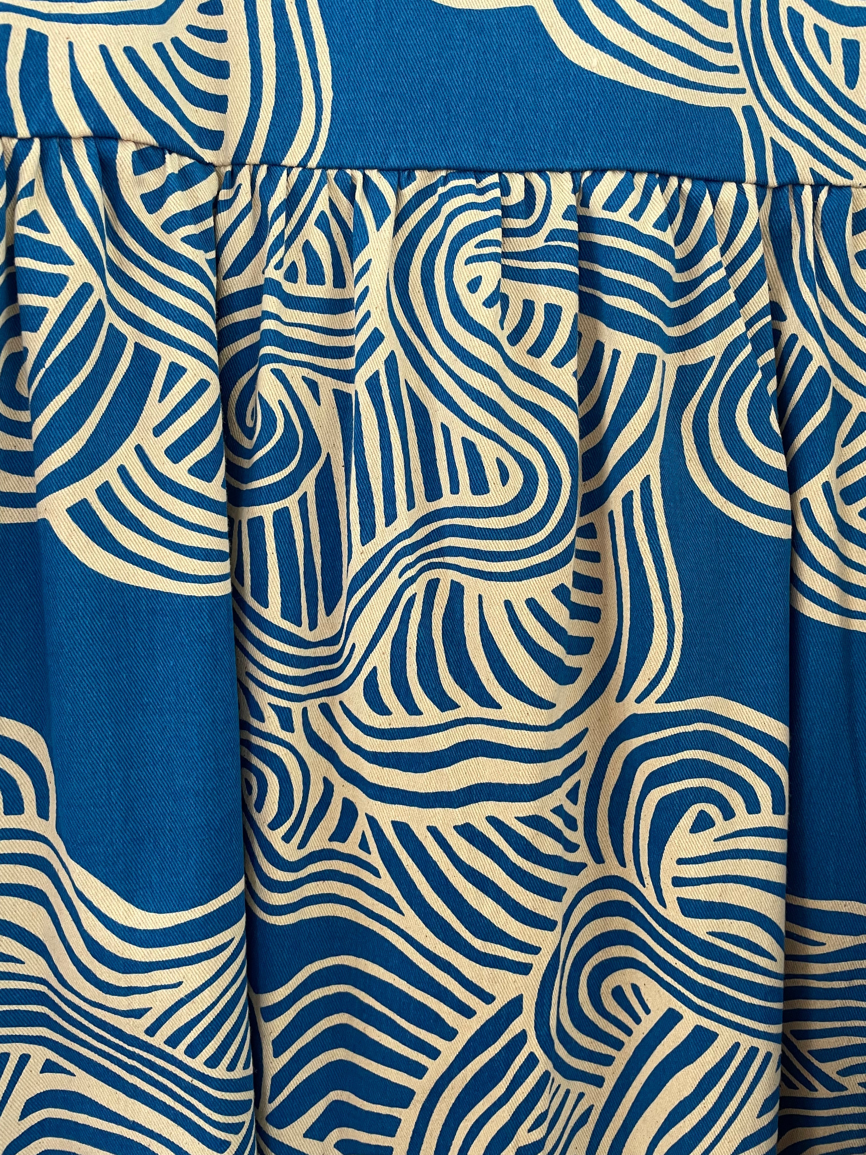 This is a very simple loose fitting yoke dress with nice deep pockets. No zips or fastenings, just chuck it on and go! Made from 100% Fairtrade organic cotton drill printed with an exclusive Thunderpants design.