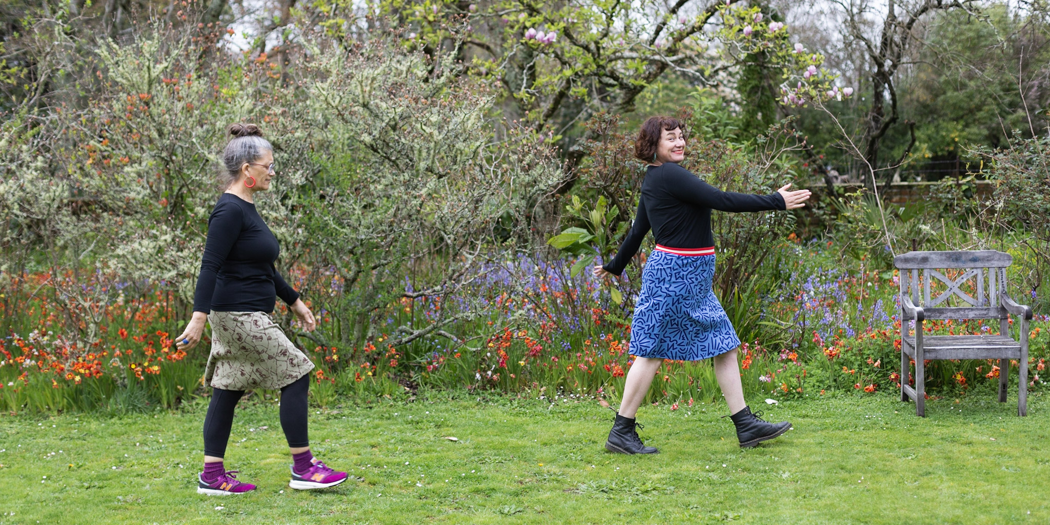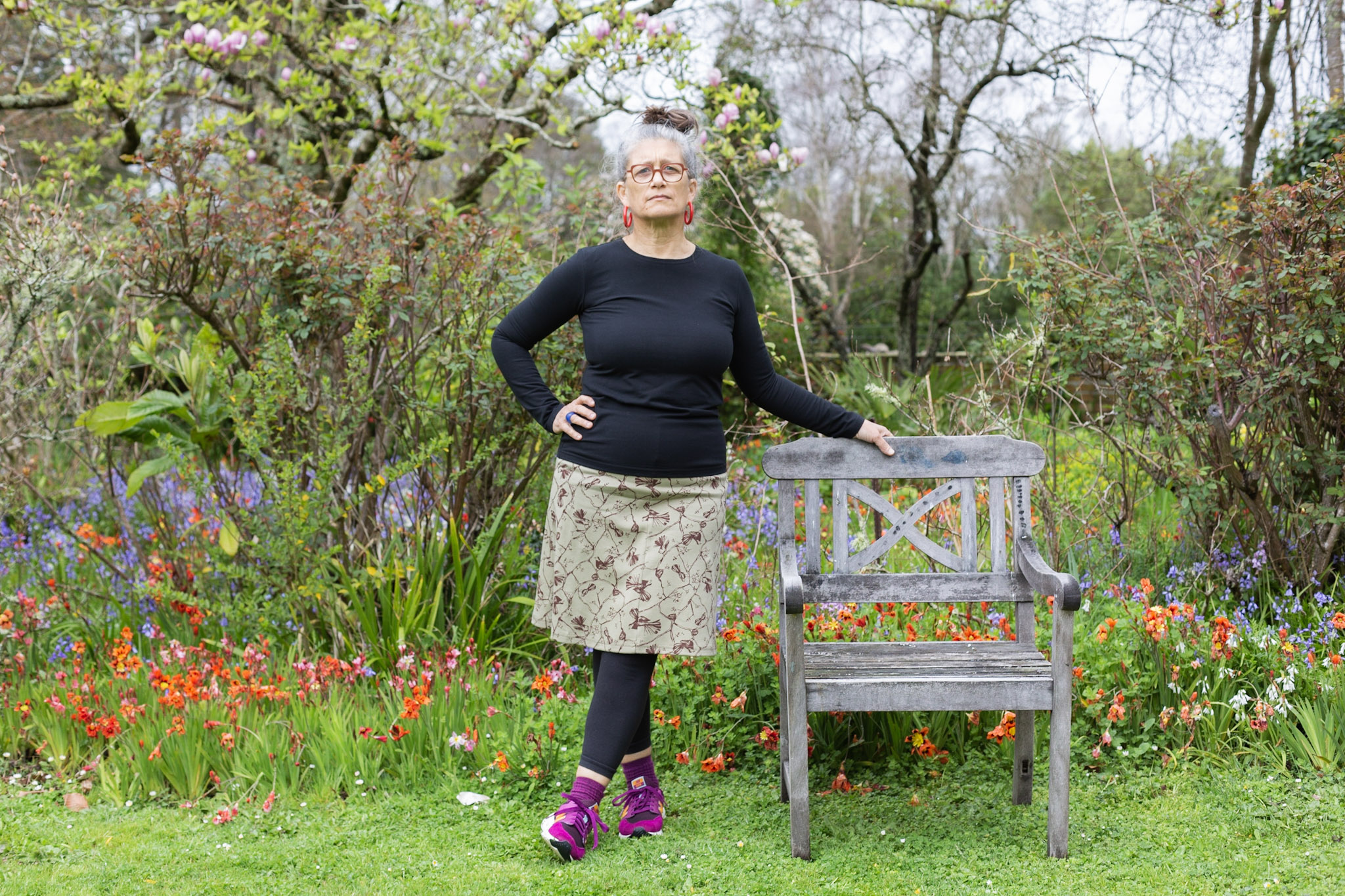 A heavyweight 100% organic cotton interlock four gore skirt. It has an easy wear elastic banded waist, pull it on and go! To change the look you can wear this either with a seam in the middle or a seam down either thigh. Models are wearing seam down the middle, flat garment showing other option.